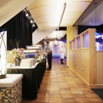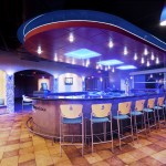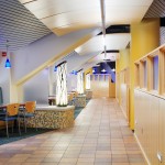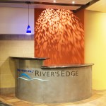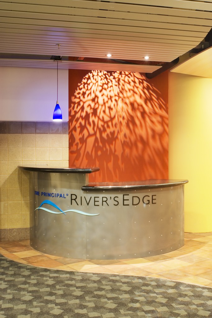 This design/build project entails a restaurant within the Wells Fargo Arena that offers views to the main entrance lobby, the arena bowl as well as the river. The long and narrow dining and sports bar areas are finished and furnished in a blend of stone, wood and metal, accented by blues and greens in the carpet and upholstery, to create a water themed atmosphere.